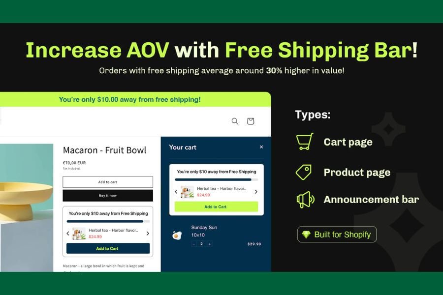 Essential Free Shipping Upsell helps Shopify stores boost sales and average order value with a free shipping progress bar and integrated upsell features. Encourage customers to spend more with personalized cart goals, offering free shipping, discounts, or rewards when targets are reached. Add product upsells, cross-sells, and cart upsells directly on product pages, cart pages, or drawers. Fully customizable and compatible with Online Store 2.0 themes, it tracks additional revenue while turning every cart into a higher-value order.