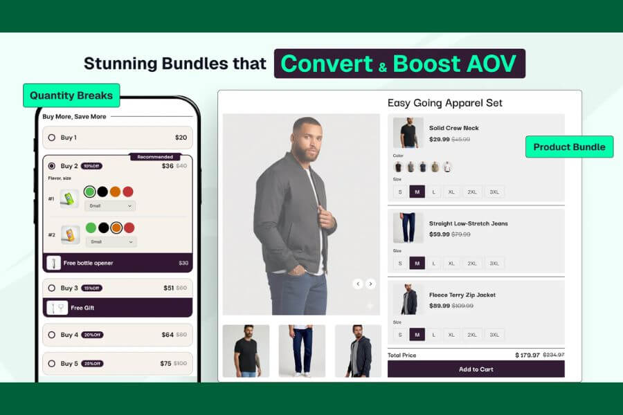 Fly Bundles Quantity Breaks helps Shopify stores boost average order value with upsell and cross-sell strategies through product bundles, combos, quantity breaks, volume discounts, and BOGO deals. Create fixed or custom bundles with unlimited variant options, progressive free gifts, and subscription or add-on upsell blocks. Showcase conversion-optimized bundles using native widgets without slowing your store, track performance with analytics, and integrate seamlessly with major side carts and page builders. Fly Bundles turns every purchase into a higher-value order.