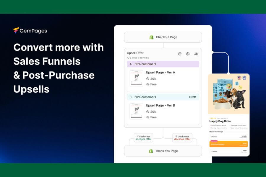 GemPages Landing Page Builder helps Shopify stores boost sales and average order value with AI-powered upsell and cross-sell tools. Build any page type: home, product, landing, collection, or advertorial, using drag-and-drop and 400+ CRO-optimized templates. Create complete sales funnels featuring post-purchase upsells, downsells, bundles, and product recommendations. Mobile-responsive, SEO-friendly, and fast-loading, GemPages integrates with 160+ Shopify apps to enhance your store, turning every visit into higher-value orders while maximizing conversions with smart upsell and cross-sell strategies.